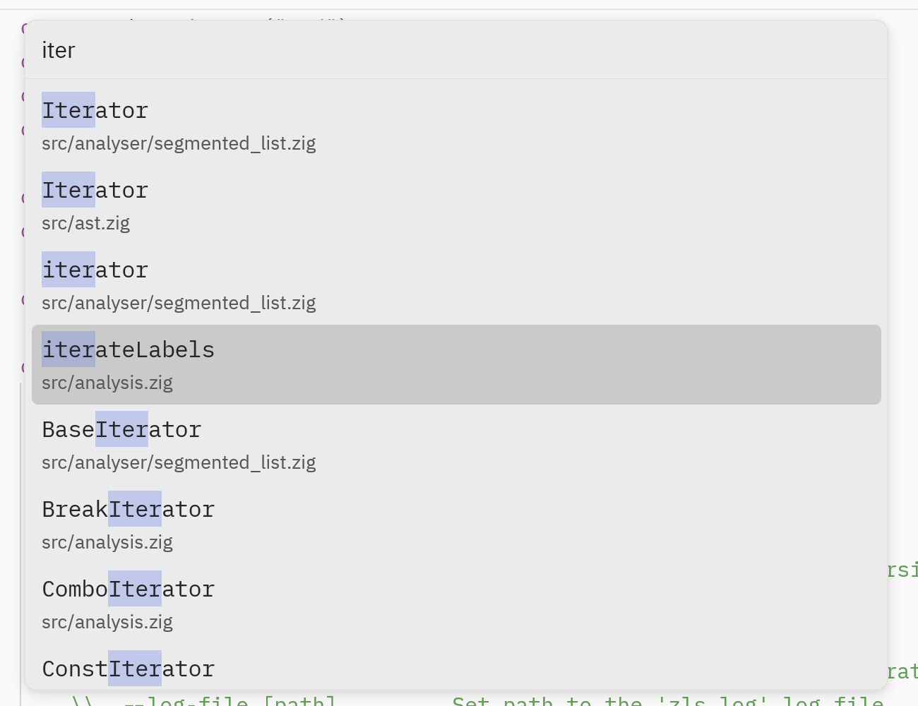 Workspace symbol search for "iter" in the ZLS codebase.